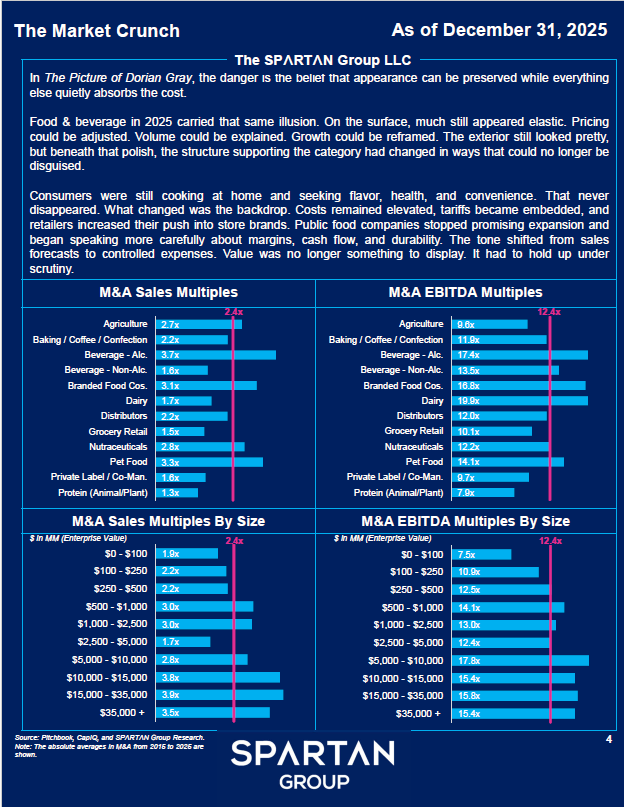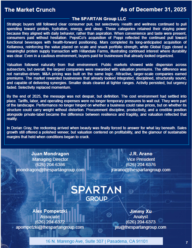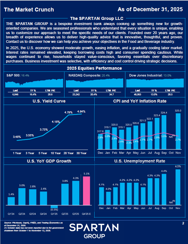 We are delighted to provide you with the latest edition of the Market Crunch Newsletter, capturing the most compelling trends and movements in the Food & Beverage sector. In this edition, we recap the M&A market activity for 2025. As the financial environment changes, we remain in your corner as a dependable advisor, offering you expert counsel and support in capital raising, acquisitions, and sales.