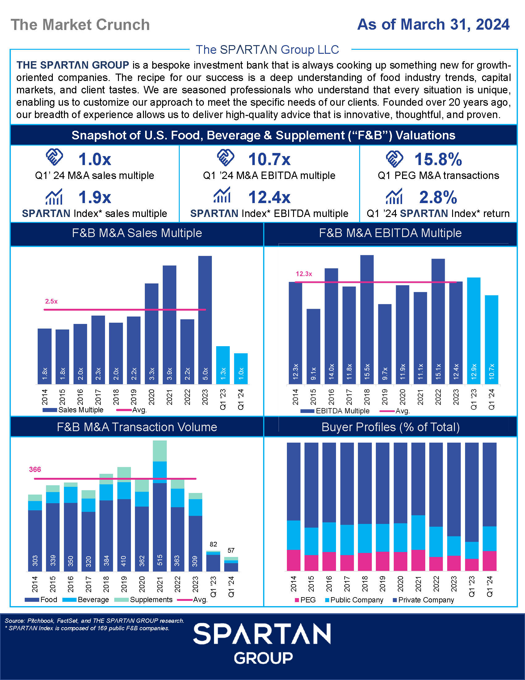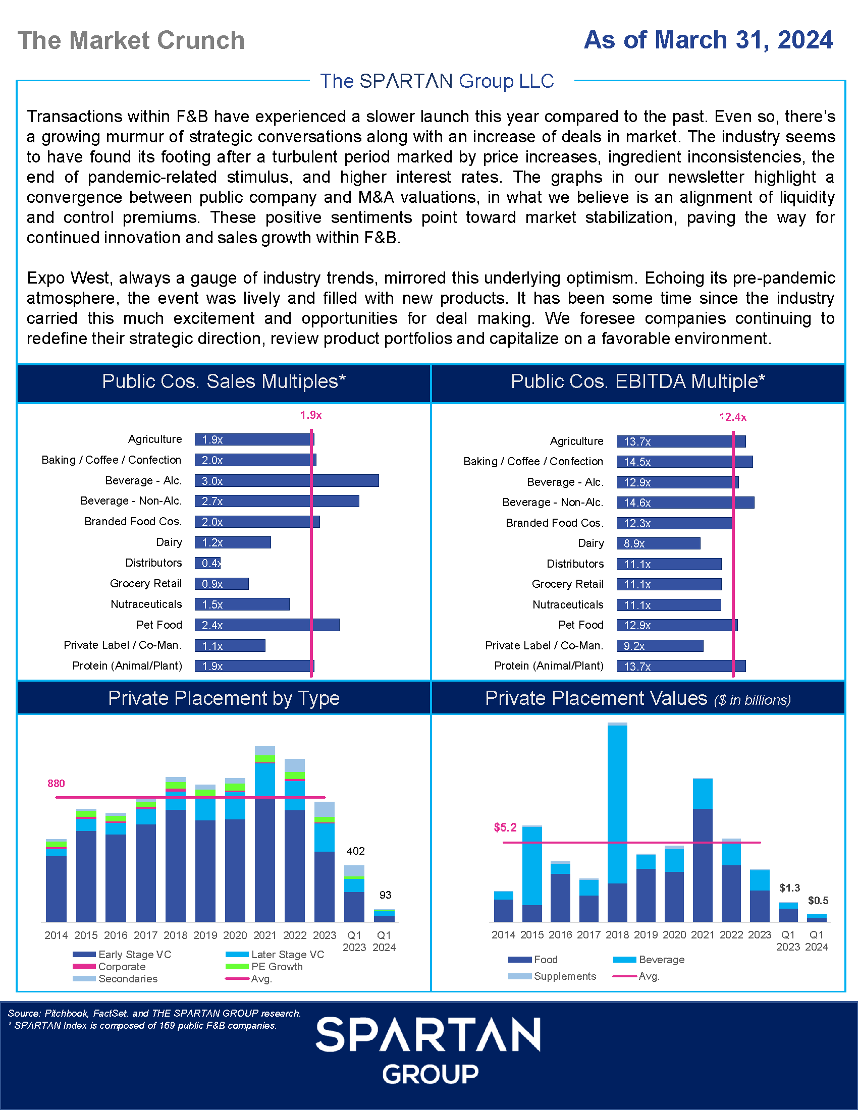 We are delighted to provide you with the latest edition of the Market Crunch Newsletter, capturing the most compelling trends and movements in the Food & Beverage sector. In this edition, we recap the M&A market activity that occurred in the first quarter of 2024. As the financial environment changes, we remain in your corner as a dependable advisor, offering you expert counsel and support in capital raising, acquisitions, and sales.